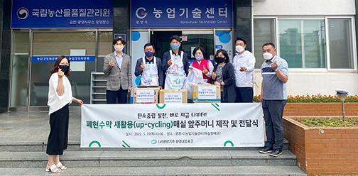광양기후환경네트워크가 매실 수확기를 앞두고 지난 19일 농업기술센터를 방문해 폐현수막을 새활용(up-cycling)한 매실 수확용 앞치마 350장을 광양시에 전달했다.