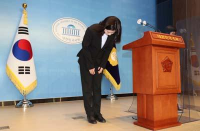 박지현 더불어민주당 공동비상대책위원장이 24일 서울 여의도 국회 소통관에서 대국민 호소 기자회견 중 고개 숙여 인사하고 있다.