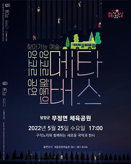 매월 마지막 주 수요일에 개최하는 2022년 문화가 있는 날 프로그램 ‘메타-버스’는 오는 10월까지 담양군 면 소재지 네 곳(무정면, 대덕면, 창평면, 봉산면)을 직접 찾아가 지역의 특색을 접목한 다양한 장르의 공연을 선보일 예정이다.
