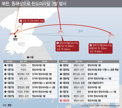 합동참모본부에 따르면 이날 오전 6시에 발사된 미사일은 정점 고도 약 540㎞까지 도달했고 비행 거리는 약 360㎞였다. 6시37분에 쏜 두 번째 탄도 미사일은 고도 약 20㎞에서 소실됐다. 6시42분께 발사된 세 번째 탄도 미사일은 정점 고도 약 60㎞에 이른 뒤 약 760㎞를 비행했다.