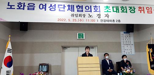노경자 회장은 취임사에서 “지난해 우리읍의 여러봉사 활동에 함께하고 도와준 회원여러분께 감사하다”며 \"여러분과 함께 어우러져가는 삶을 통해 사랑의 봉사·감사의 봉사·축복의 봉사를 실천하겠으며 회원들의 권익보호는 물론 저소득 소외계층과 어려운 이웃을 봉사 정신으로 받들어 나가겠다”고 말했다.