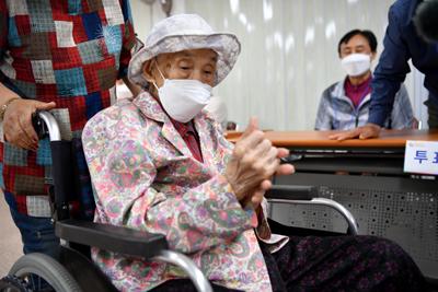 꽃무늬 블라우스에 차양이 달린 모자를 쓰고 온 박 여사는 세월의 흔적처럼 깊게 패인 주름과 검버섯에도 불구하고 정정한 모습이었다. 투표소로 향하자며 손가락을 들어 방향을 가리키는 등 박 여사의 기운 찬 모습에 자식들은 함박웃음을 지으며 휠체어를 밀었다.