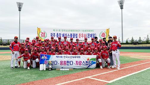 광주광역시 대표로 출전한 충장중학교 베이스볼클럽 야구부가 30일 제51회 전국소년체전(야구-16세이하부)에 참가해 준우승, 은메달을 목에 걸었다