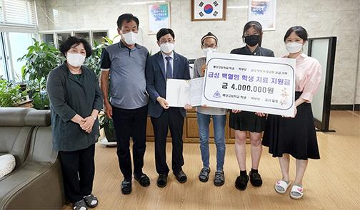 예당고등학교는 지난 6월 2일 학생·학부모·교사 모두가 모금활동에 참여하여 모은 성금 400만원을 김○○학생에게 전달했다.