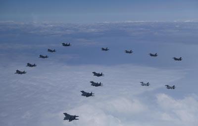 전투기들은 이날 오전 서해상 공역에서 공격 편대군을 형성해 적 위협에 압도적으로 대응하는 비행을 했다.