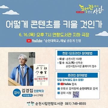 순천시립연향도서관은 오는 16일 저녁 7시 연향도서관 극장 ‘연’에서 대중 인문학 확산의 선두주자로 손꼽히는 김경집 인문학자를 초청하여 시민인문학 강의를 개최한다.
