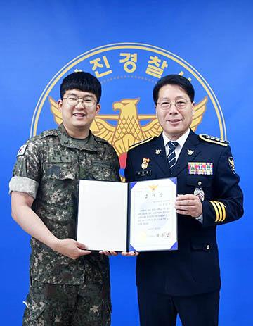 강진경찰서는 지난 8일 교통사고를 목격하고 운전자를 신속하게 대피시켜 주민의 귀한 생명을 안전하게 구조한 육군 제31보병사단 마천목대대 조민재 중사에게 감사장을 수여했다.