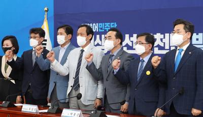 더불어민주당 우상호 비상대책위원장과 박홍근 원내대표가 14일 오후 서울 여의도 국회에서 열린 더불어민주당 민생우선실천단 발대식에서 \"더불어민주당, 오직 민생!\" 구호를 외치고 있다. /뉴시스