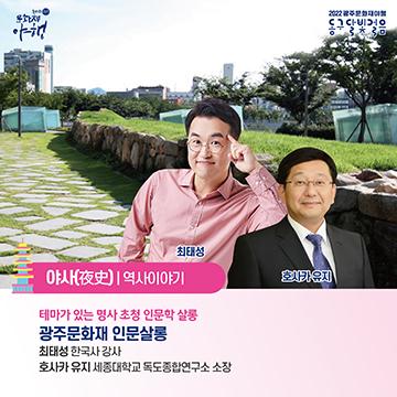 광주 동구는 17~18일 대면으로 진행하는 ‘광주문화재야행 동구 달빛걸음’에 최태성 한국사 강사와 일본계 한국인 정치학자 호사카 유지 세종대학교 독도종합연구소장을 초청해 테마가 있는 ‘인문살롱’을 개최한다고 밝혔다.