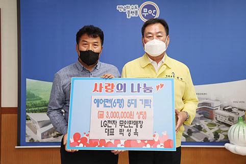 무안군은 지난 15일 무안읍에 위치한 LG전자 무안판매장 박성옥 대표가 관내 취약계층 이웃들에게 전달해달라며 에어컨 5대(300만원 상당)를 기탁했다고 밝혔다.