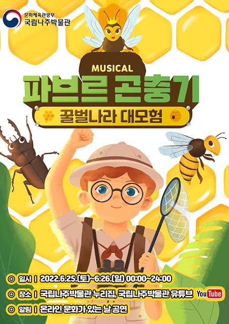 국립나주박물관은 오는 25~26일 이틀간 박물관 누리집과 유튜브 채널을 통해 친환경 어린이 뮤지컬 ‘위기의 꿀벌나라, 도와줘 파브르’를 중계한다고 밝혔다.
