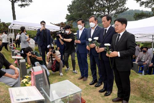 우상호 더불어민주당 비대위원장과 강기정 광주시장이 5일 오후 광주 북구 망월동 민족민주열사묘역에서 열린 35주기 이한열 열사 추모식에서 헌화하고 있다.