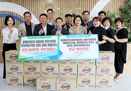 광영동 14개 사회단체는 지난달 3일 아파트 화재로 주거지가 전소되는 피해를 입은 주민을 위로하기 위해 현금 400만 원과 라면 20박스(50만 원 상당)를 후원했으며, 광영동사무소 희망 나눔 냉장고 운영을 돕기 위해 160만 원을 지원했다.