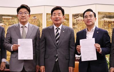 권성동 국민의힘 원내대표와 박홍근 더불어민주당 원내대표가 18일 서울 여의도 국회 의장실에서 김진표 국회의장 주재로 열린 여야 원내대표 회동에서 민생경제안정특별위원회 구성과 교섭단체 대표연설과 대정부질문을 위한 본회의 일정에 합의하고 합의문을 들어보이고 있다. /뉴시스
