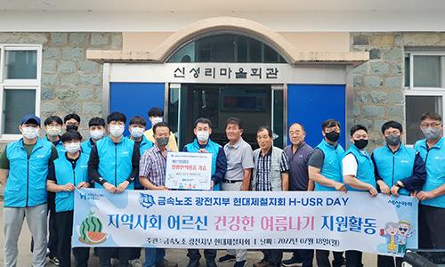 현대제철 순천공장 노동조합은 18일 1팀 1촌 자매결연을 한 인근 신성리 마을에 어르신 건강한 여름나기를 위한 물품전달 및 봉사활동을 펼쳤다.