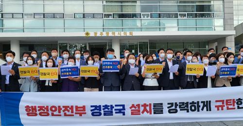 국민의힘을 제외한 광주시의회·광주 5개 자치구 기초의원들은 3일 \"행정안전부 경찰국 설치를 강력 규탄한다\"고 밝혔다.