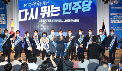 이날 오전 제주 \'난타 호텔\'에서 열린 제주 지역 합동 연설회에서 선두 주자인 이재명 후보는 \'당원이 주인인 민주당\'을 강조하며 당심에 러브콜을 보냈다. 97세대 주자인 박용진 후보는 \'이재명 방탄\' 논란의 당헌 80조 개정 당원 청원을 비판하며 이 후보와 대립각을 세웠고, 강훈식 후보는 자신이 여러 대선후보를 세울 수 있다며 \'탈계파성\'을 부각시켰다.