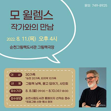 <모 윌렘스 작가와의 만남> 참여 접수는 8일부터 10일까지 순천시립도서관 홈페이지에서 선착순으로 신청 가능하며, 자세한 사항은 순천그림책도서관(061-749-8925)으로 문의하면 된다. /순천=조순익 기자