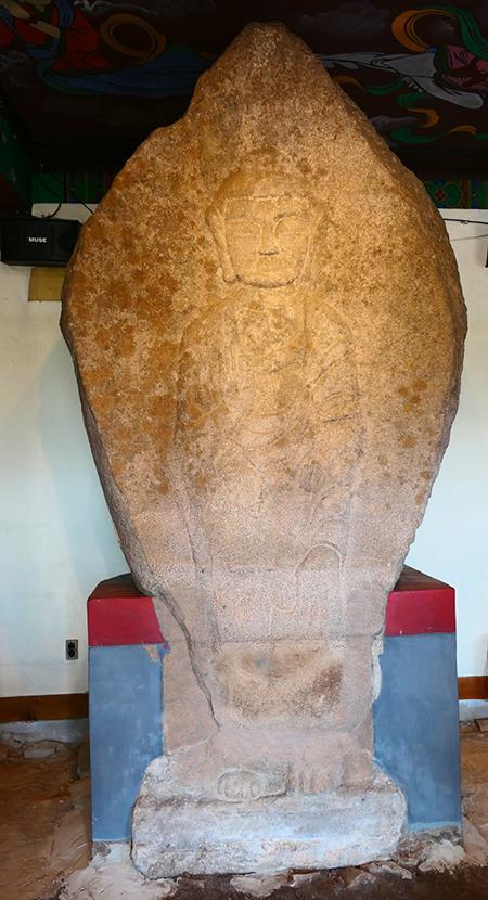 자연석을 다듬어 부처의 몸에서 나오는 성스러운 빛을 형상화 한 광배 형태를 만들고 그 중앙에 여래입상을 조각했다.