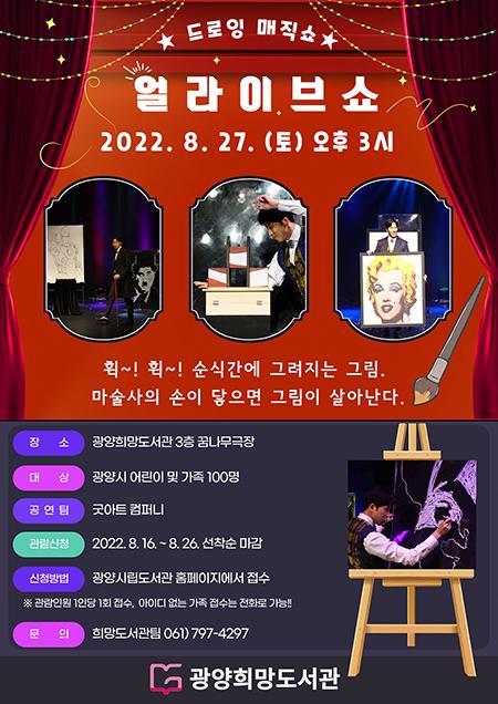 광양시 희망도서관이 오는 27일 오후 3시 꿈나무극장에서 어린이 가족 100명을 초청해 드로잉 매직쇼 ‘얼라이브 쇼’를 공연한다.