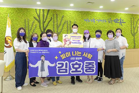 순천시장애인체육회는 지난 17일 가수 김호중 팬카페의 봉사 동호회인 ‘셀럽아리스’로부터 후원금 1천만 원을 전달받았다.
