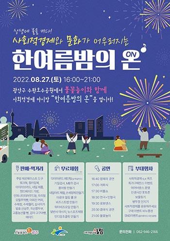 광주 광산구가 27일 수완호수공원 일대에서 사회적경제와 문화가 어우러지는 ‘한여름밤의 온(ON)’ 행사를 개최한다.
