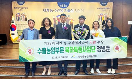 군에 따르면 북하특품사업단 정병준 대표가 지난 18일 서울은행회관 국제회의실에서 열린 ‘제28회 세계 농수산업기술상’ 시상식에서 수출농업부문 대상을 받았다. 이전까지 농업기술개발 등 다른 분야 수상은 있었지만, 수출농업 분야는 장성군 최초 사례다.