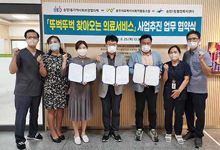 광주 광산구 송정1동 지역사회보장협의체가 25일 송정1동, 광주의료복지사회적협동조합과 ‘뚜벅뚜벅 찾아오는 의료서비스’ 업무협약을 체결했다.