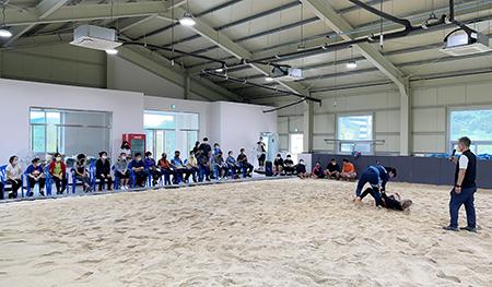 이번 씨름교실은 각각 한 시간씩 총 2개 교시로 진행됐다. 씨름교실 첫 교시 시범선수들이 씨름기술을 선보일 때마다 환호성이 터졌다. 처음 접하는 씨름기술에 모두가 흥이 나는 씨름마당이었다.