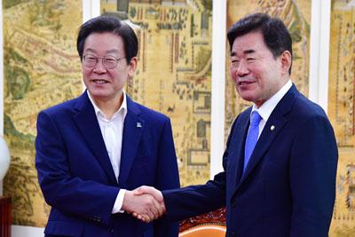 이재명 더불어민주당 신임 대표는 31일 김진표 국회의장을 예방하고 \'민생 협치\'에 입을 모았다.