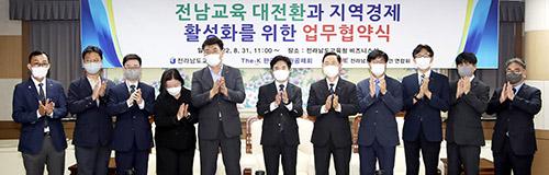 전남도교육청이 지난달 31일 청사 5층 비즈니스실에서 한국교직원공제회·전남도소상공인연합회와 지역경제 활성화를 위한 업무협약(MOU)을 체결했다.