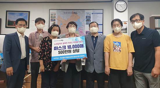 순천시는 지난달 31일 ㈜굿킵스(대표 평자방)와 전남동부권발달장애인평생교육지원센터(센터장 정채권)가 추석 명절을 앞두고 500만 원 상당의 마스크 1만 장을 노인일자리 참여 어르신들에게 기탁했다고 밝혔다.
