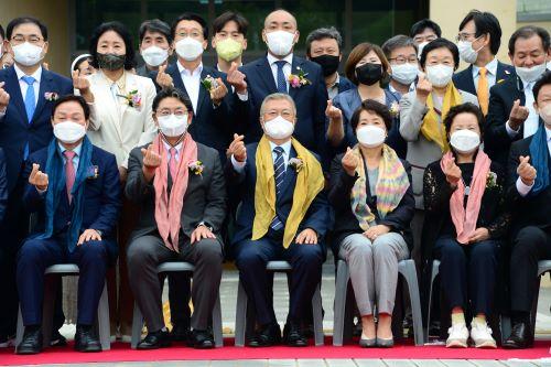 1일 오전 경남 김해시 진영읍 봉하마을에서 열린 노무현 대통령 기념관 개관식에 참석한 문재인 전 대통령을 비롯한 내빈들이 기넘촬영을 하고 있다.