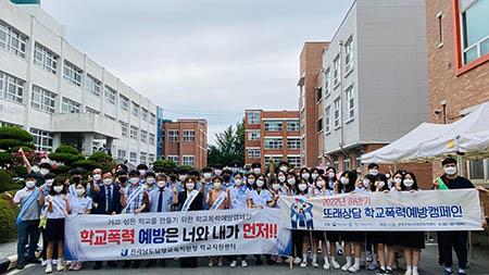 이날 캠페인에서 학생, 교직원, 교육청 및 유관기관 관계자들은 함께 어깨띠와 피켓을 들고 학생들에게 반가운 인사와 더불어 ‘웃음소리 가득한 학교, 학교폭력 없는 학교!’라는 구호와 작은 홍보물을 건네며 격려했다.