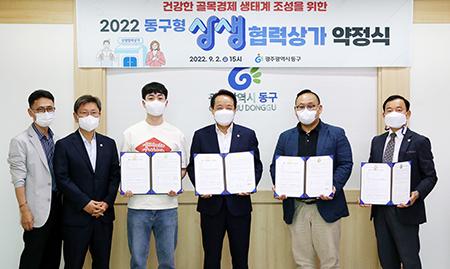 광주 동구는 지난 2일 건강한 골목 경제 생태계 조성을 위해 추진한 ‘동구형 상생협력상가’ 공모에 선정된 동명동, 충장동, 산수동 상생협력상가 3곳과 협약을 체결했다고 밝혔다.