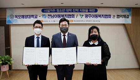 목포해양대학교가 전남아동복지협회 및 광주아동복지협회와 5일 오전 11시 대학본부 2층 회의실에서 시설거주 청소년 대학 진학 지원을 위한 업무협약을 체결했다.
