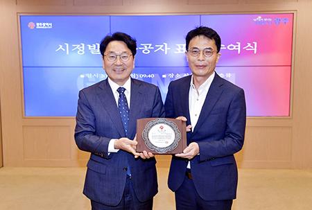 광주시는 5일 시청 비즈니스룸에서 ‘의로운 시민’으로 선정된 최상신 씨에게 표창패를 수여하고 감사의 마음을 전했다.