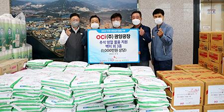 ㈜OCI 광양공장이 추석을 맞아 광양시 태인동에서 지역사회 환원사업의 일환으로 백미 10kg 150포(500만 원 상당)와 생활용품(라면, 커피믹스, 휴지)(500만 원 상당)을 광양시 사랑나눔복지재단을 통해 태인동 주민센터에 지정기탁했다.