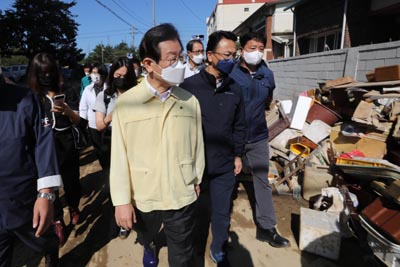 이재명 더불어민주당 대표가 7일 태풍 힌남노 피해를 입은 경북 포항 현장 점검에 나섰다. 이 대표는 현장을 둘러본 뒤 특별재난지역 선포와 재난지원금 상향 조정 등의 대처가 신속히 이뤄지도록 노력하겠다고 밝혔다.