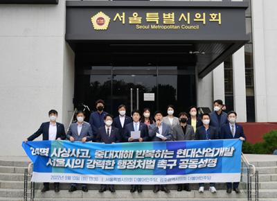 두 의회 소속 민주당 의원 일동은 13일 오후 서울시의회 본관 앞에서 발표한 공동성명서를 통해 \"불법·부실 공사로 소중한 국민의 생명을 앗아간 현대산업개발에 대해 등록말소 처분 등의 강력한 행정조치를 내려 줄 것\"을 서울시에 촉구했다.