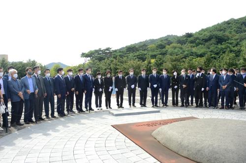 이재명 더불어민주당 대표가 14일 오후 당 지도부들과 함께 경남 김해시 봉하마을을 찾아 고 (故) 노무현 전 대통령 묘역에 참배하고 있다.