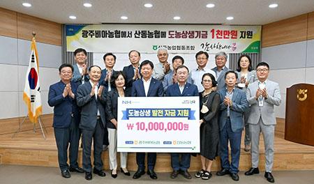 광주비아농협이 구례군 산동농협에 도농상생 발전지원 자금 1000만원을 전달했다.