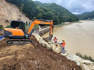 공사는 연휴를 앞두고 긴급 대피한 주민들의 불편을 최소화하기 위해 상황이 발생한 지난 6일부터 90명의 인력과 중장비 22대(굴삭기 8대·덤프 12대 등)를 투입해 제당 성토다짐과 마대 쌓기, 방수포 덮기 등 응급복구를 진행하고 있다.