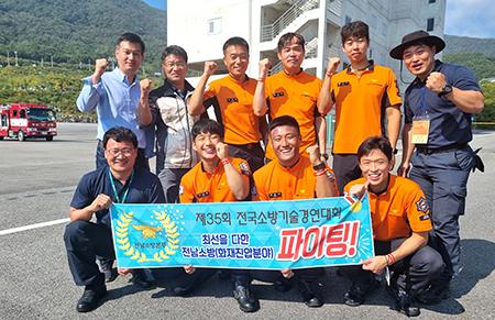 전남소방본부는 최근 공주 중앙소방학교에서 치러진 제35회 전국 소방기술 경연대회에서 화재진압 분야 \'전국 1위\'를 차지해 행정안전부장관상을 수상했다고 지난달 30일 밝혔다.