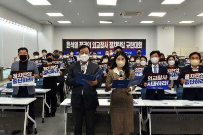 민주당 광주시당은 이날 이병훈 시당위원장과 5개 구청장, 광역의원 등 50여 명이 참석한 가운데 시당 대회의실에서 \'윤석열 정권 외교참사, 정치탄압 규탄대회\'를 열었다.