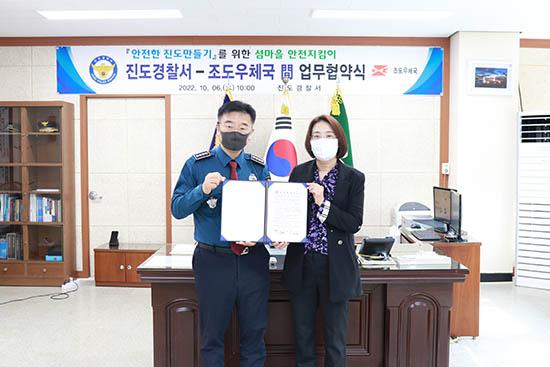 진도경찰은 6일 진도경찰서 2층 예향홀에서 안전한 진도만들기 추진을 위해 조도우체국장과 공동체 치안활동 구축을 위한 업무협약을 체결하였다.
