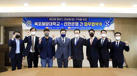 목포해양대학교(총장 한원희)와 신한은행(은행장 진옥동)이 목포해양대학교 대학본부 2층에서 \'헤이영 캠퍼스 플랫폼 구축\'을 위한 업무 협약을 체결했다.