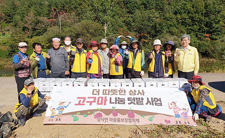 상사면마중물보장협의체는 지난 6월 수익 창출과 어려운 이웃을 돕기 위해 나눔 텃밭에 고구마를 식재했다. 틈틈이 짬을 내 고구마 밭의 잡초를 제거하는 등 4개월 이상의 정성을 들였고 이날 120박스의 고구마를 수확했다.