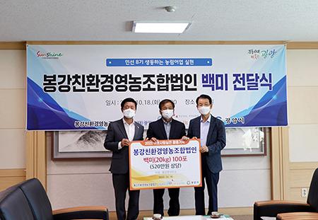 전달식에 참여한 박광기 봉강친환경영농조합법인 대표는 “어렵고 힘든 시기를 보내고 있는 이웃에게 작은 보탬이 됐으면 좋겠다”며, “앞으로도 나눔을 실천하며 지역사회를 위해 활동하도록 노력하겠다”고 전했다.