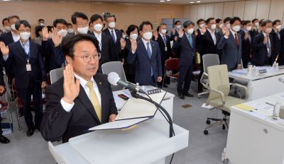 강기정 시장과 시 공직자들이 20일 오전 광주 서구 광주시청 중회의실에서 열린 국회 행정안전위원회 국정감사에서 피감기관 증인 선서를 하고 있다.